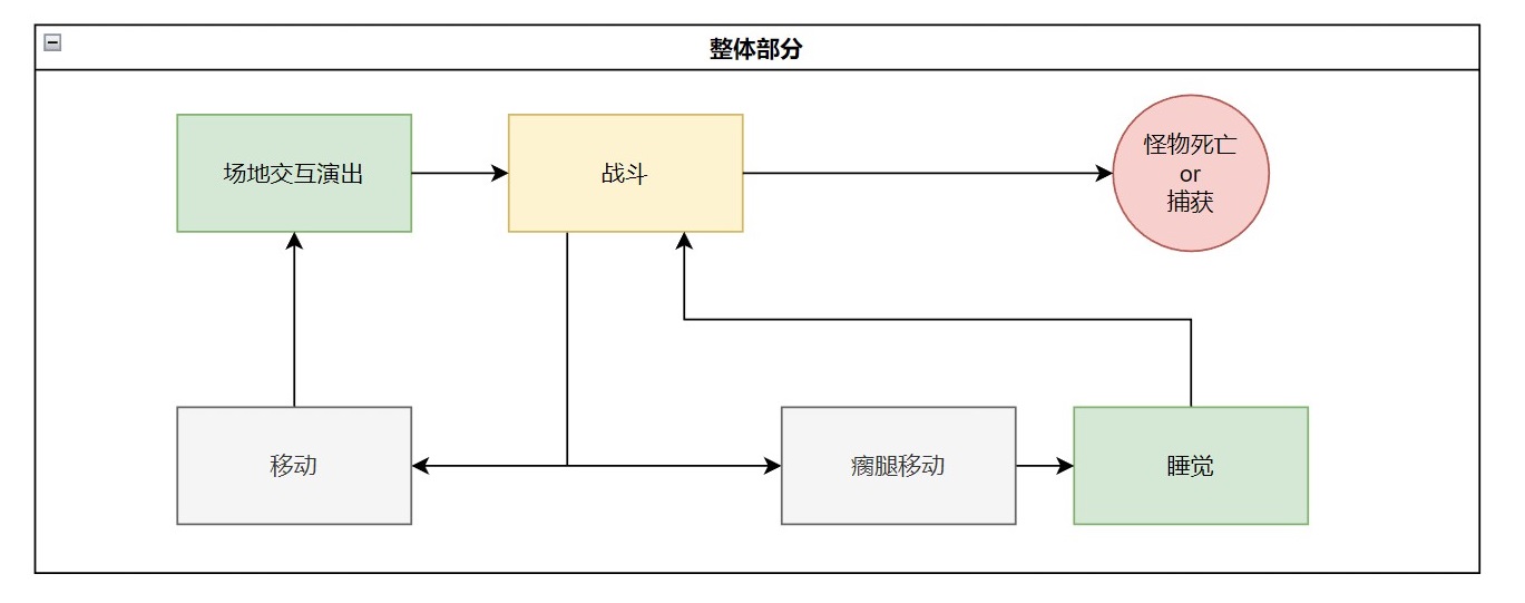 参考上图,考虑到怪物猎人是一个规则设计非常繁多的游戏,我们先把怪物的AI行为分为战斗和其他两部分,本文主要讨论战斗相关的AI逻辑。