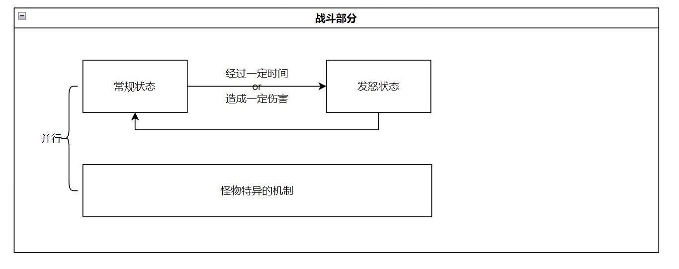 根据体验,怪物一般会有正常状态、愤怒状态(、疲劳状态)几种,同时怪物可能还有自身的强化状态的逻辑: