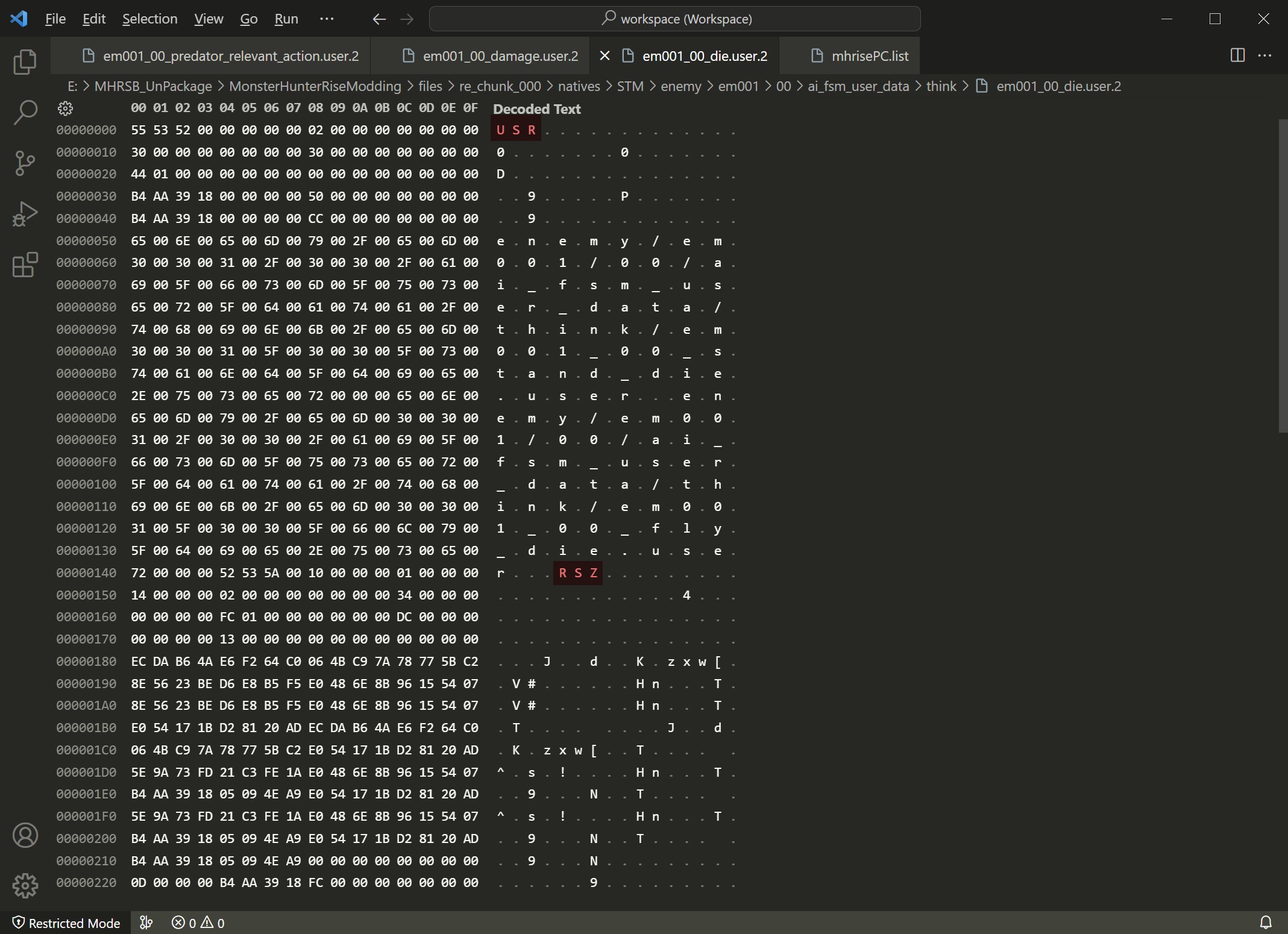 很可惜,目前用于拆包后的.user.2类型文件的MHR Editor,尚且不支持打开编辑这些AI文件,姑且用HexEditor试着看了下一些文件的内容,看到了一些类似USR开头、RSZ用作分割之类的信息,但是也没有啥有价值的内容。