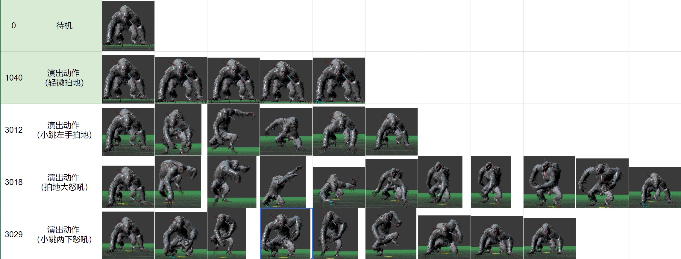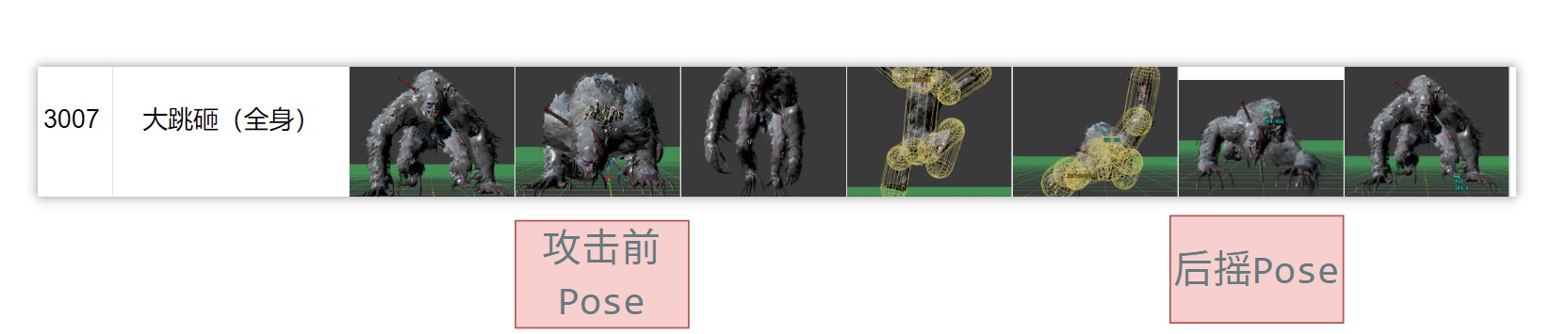 本文的初衷就是能力有限,找不到狮子猿的待机Pose,拆包的动画第一个看到就是待机,一个猿类的待机,身体与地面平行,很标准的idle,也很适合用做各种攻击的起手