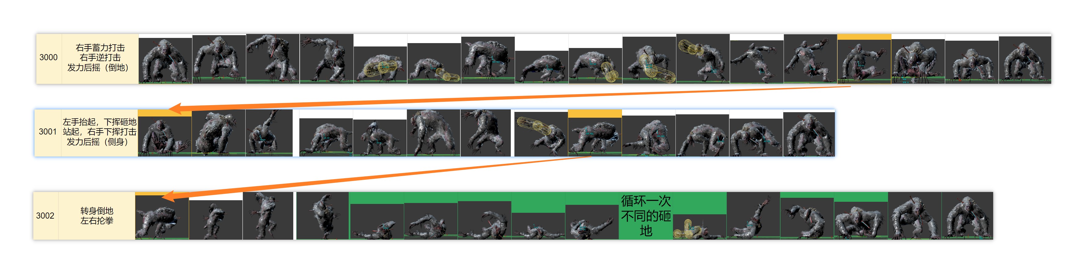 - 其中黄色代表“花样动作”——不太容易记住的“花里胡哨”的攻击动作,