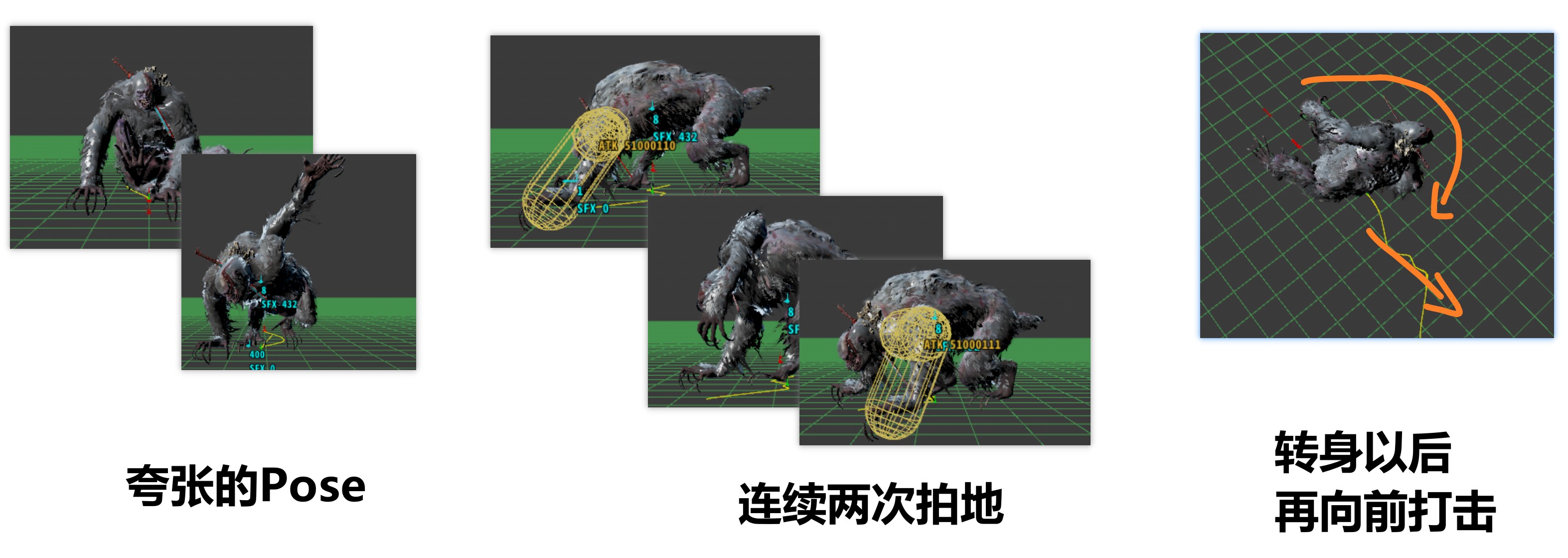 甚至在“相同性质”的攻击上,会给出不同的攻击前Pose和后摇Pose(比如四方向拍地攻击的拍地前预备Pose和后摇Pose),以此来进一步丰富玩家体验。(奢侈!X4)