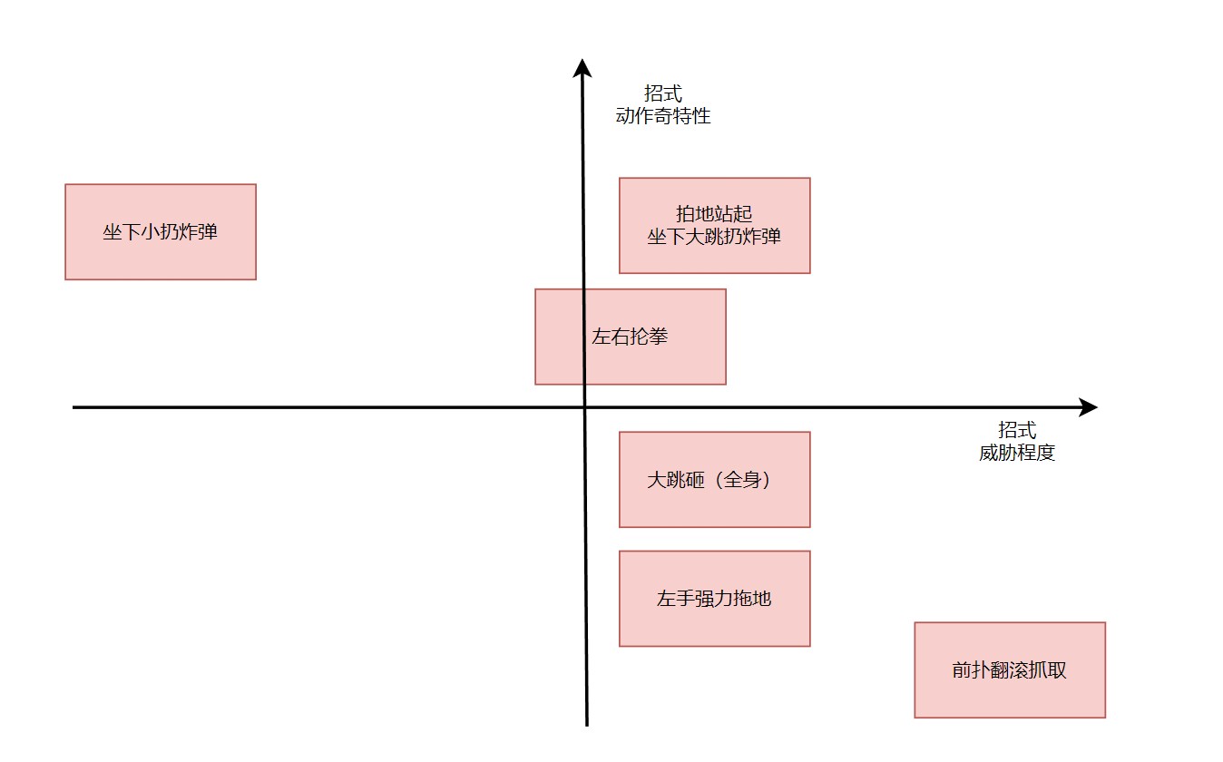 当然,玩家的感受,是动作受到AI控制后播放、玩家与之交互的结果,和直接的动作比例是有差别的。也是为了突出存在感的高低,我们将攻击动作划分为:容易记住的标志动作、不容易记住的花样动作来展开叙述。